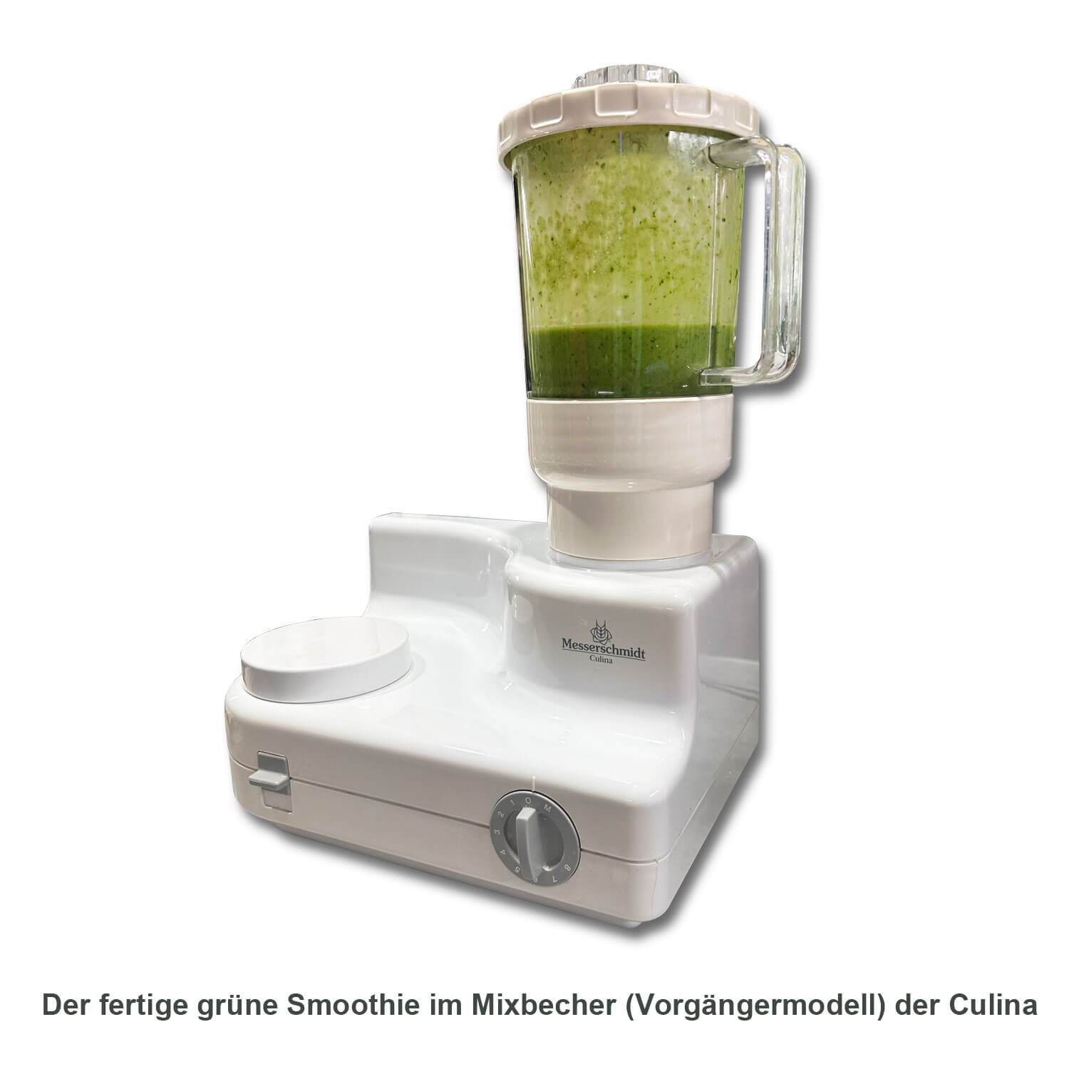 Der Mixbecher besteht aus langlebigen, hochwertigen Kunststoffteilen in bewährter Messerschmidt-Qualität. Das Messer wird durch Aufsetzen auf den Schnellantrieb der MaxiMahl Culina auf 20.000 U/min beschleunigt.